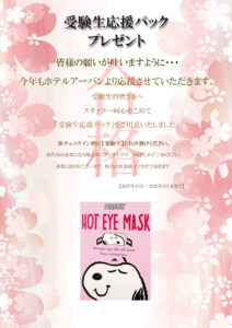 お知らせ 受験生応援パックをプレゼント!! 2025.12.11 平素よりホテルアーバンをご利用いただきまして、誠にありがとうございます。 今年もホテルアーバンより受験生の皆様へ、ごゆっくりとおくつろぎいただきたく、受験生応援パックをプレゼントさせて頂きます。 受験生の方は、フロントにて受験生とお申し付け下さいませ。 一組様につき、お一つお渡し致します。 また、デスクスタンド、加湿器の無料貸出も準備しておりますので、合わせてお気軽にお申し付け下さいませ。 ※いずれも数に限りがございます。予めご了承下さいませ。